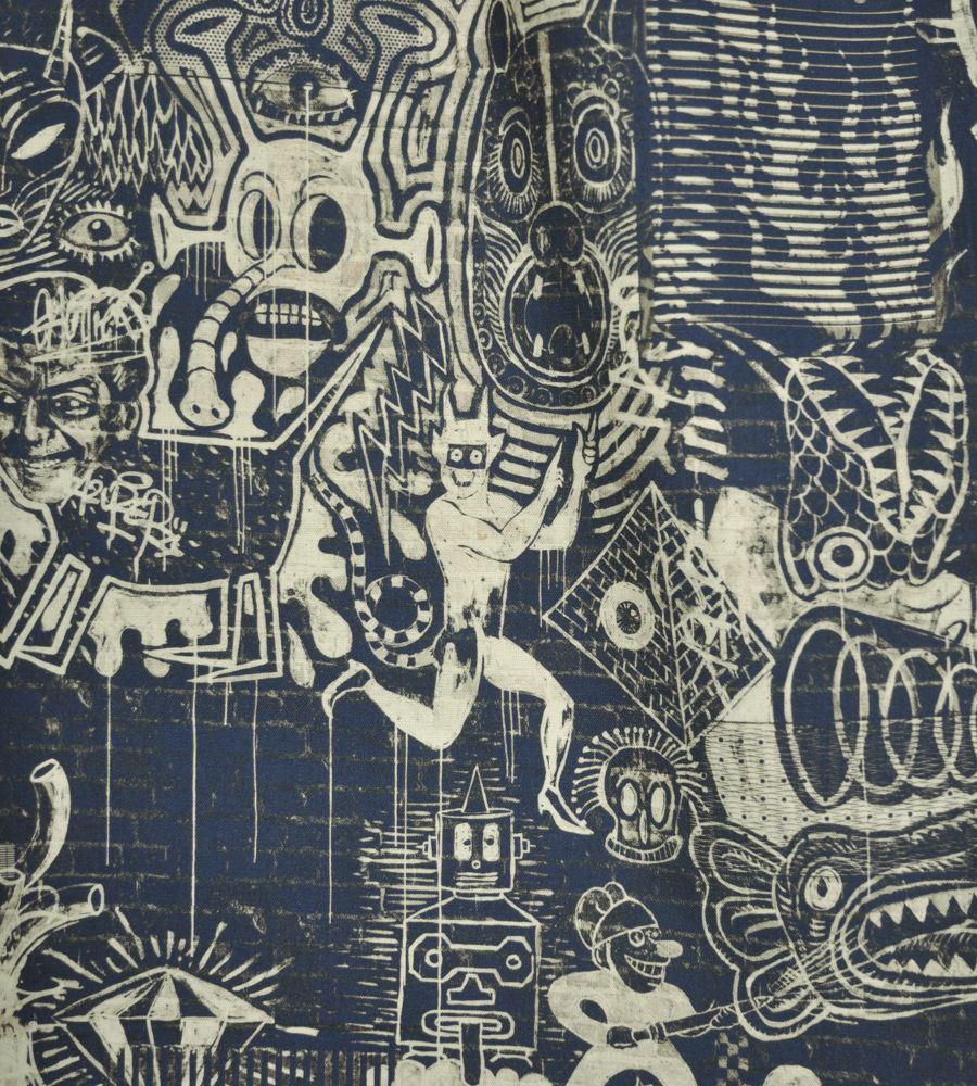 Jean Paul Gaultier Street Indigo egyedi design textil. Jean Paul Gaultier, a világhírű francia avantgárd divattervező, a luxus divatvilág ikonikus alakja, merész textil és tapéta kollekcióval lepte meg a lakberendezés világát. A kollekció gyártásával francia Lelievre céget bízták meg.
