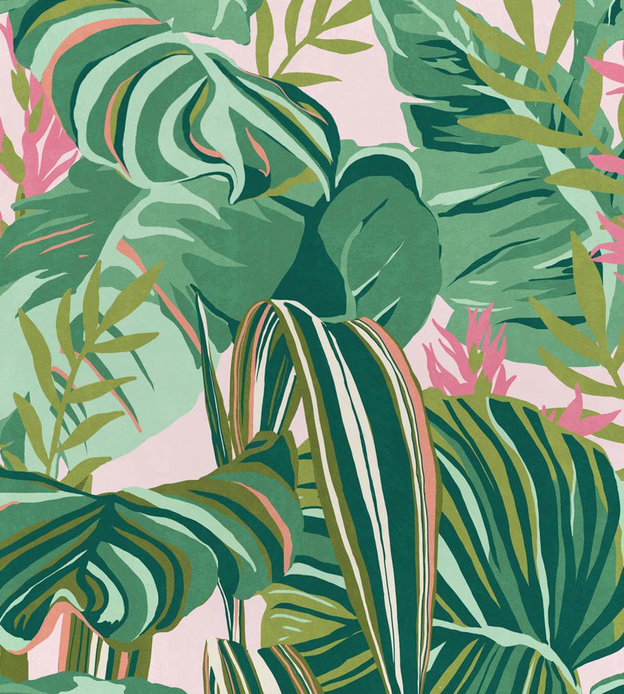 Mind The Gap Tropical Foliage Green, Pink level mintás tapéta.