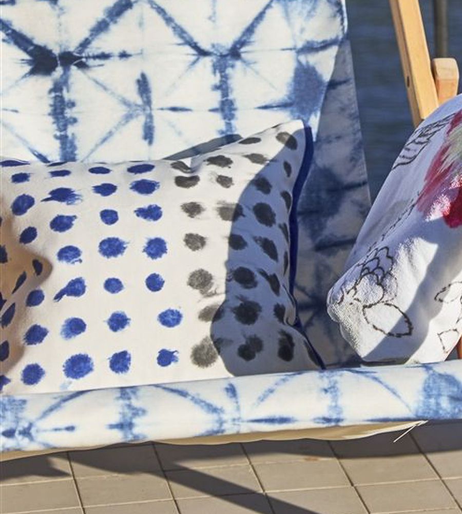 Designers Guild Amlapura Outdoor Cobalt csíkos textil. A Designers Guild lakberendezési márka alapítója a híres angol tervező Tricia Guild, a látványos minták és élénk színek nagymestere. Színpompás függöny és kárpit anyagai, tapétái és szőnyegei hatalmas népszerűségnek örvendenek világszerte belsőépítészek és lakberendezők körében.