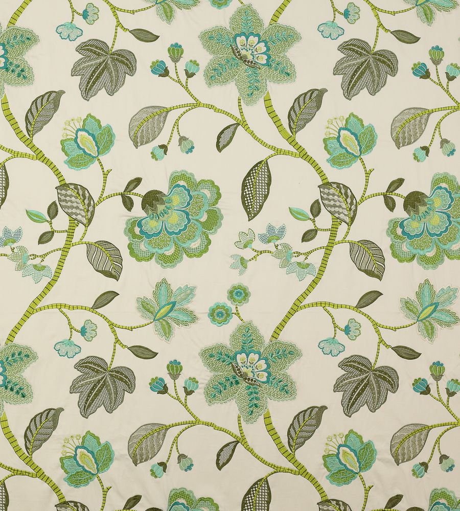Manuel Canovas Mina Turquoise virágmintás textil. Manuel Canovas a látványos minták és élénk színek mestere, számos lakástextil és tapéta kollekció megálmodója. A kezdetek óta mindegyik kollekciója hatalmas sikert arat. Jellemző színeinek és egzotikus mintáinak köszönhetően a stílusa utánozhatatlan és azonnal felismerhető. Manuel Canovas a neves angol Colefax & Fowler gyártóval működik együtt, aki világszerte forgalmazza a szöveteit és a tapétait.