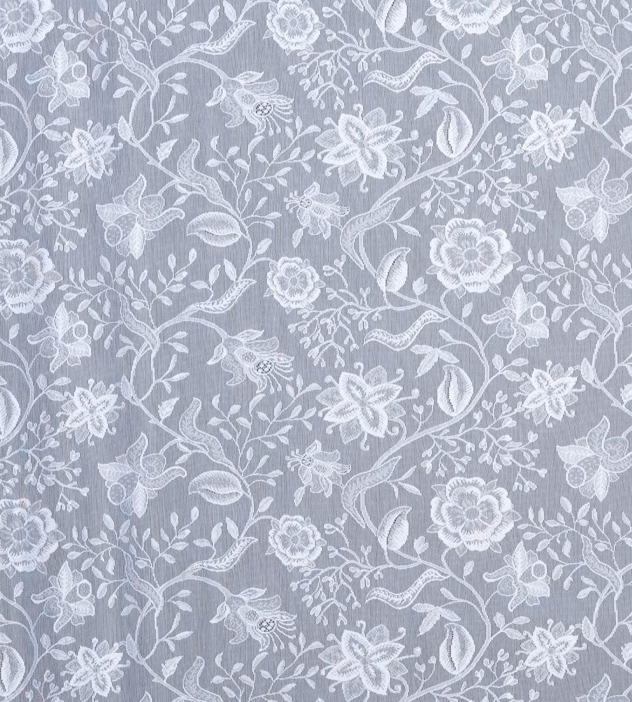 MYB Textiles Madalyn White virágmintás fényáteresztő függöny textil. Az MYB Textiles Abercromby kollekció klasszikus virágos, barokk, kasmír dekorokat, illetve modern stílusú geometrikus csipke textileket tartalmazz. A fényáteresztő függöny anyagok dupla szélesek és folyóméterenként rendelhetőek. MYB Textiles a kivételes szépségű skót pamut csipke világhírű gyártója. A termék kínálatában sokféle modern és klasszikus fényáteresztő függöny anyag, illetve hagyományos pamut csipke függöny található.