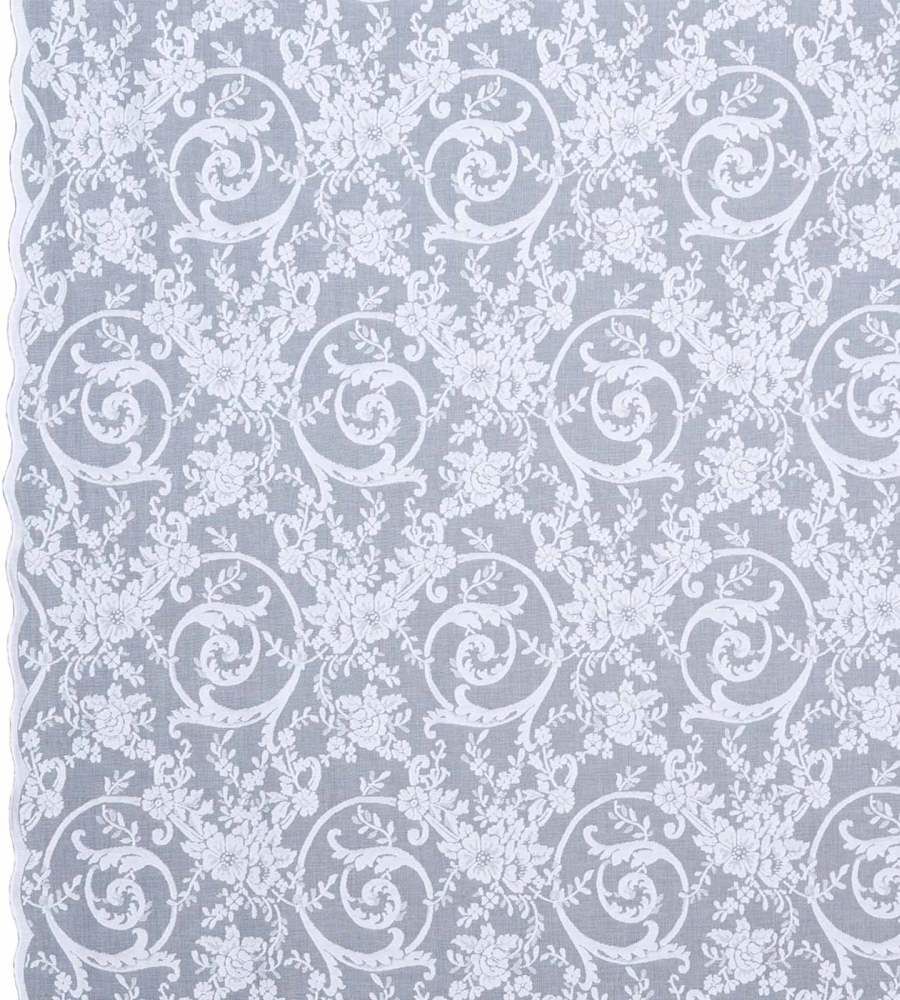 MYB Textiles Peony Scroll White virágmintás fényáteresztő függöny textil. A Brodie kollekció az Morton, Young & Borland egyedülálló klasszikus minta archívumából lett létrehozva. Ebben a kollekcióban klasszikus mintázatú barokk és virágos fényáteresztő függöny anyagokat találhatunk, melyek natúr árnyalatokban, illetve hatásos fekete és szürke színekben rendelhetőek. A fényáteresztő textilek 175 cm szélesek és folyóméterenként vásárolhatóak. MYB Textiles a kivételes szépségű skót pamut csipke világhírű gyártója. A termék kínálatában sokféle modern és klasszikus fényáteresztő függöny anyag, illetve hagyományos pamut csipke függöny található.