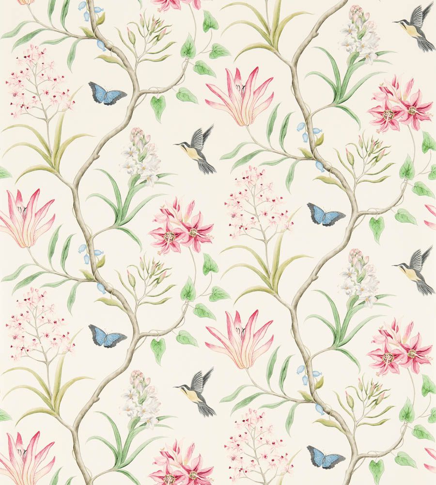 Sanderson Clementine Chintz madár mintás tapéta. A Sanderson Voyage of Discovery tapéta kollekciót az egzotikus utazások ihlették. A kollekció antik térképekből, trópusi stílusú pálmalevelekből, magnolia virágokból, korallokból és madár mintás tapétákból áll össze, melyek több árnyalatban is rendelhetőek. A Voyage of Discovery tapéta kollekció különlegessége a látványos Picture Gallery dekor, madarakkal, pillangókkal és levelekkel. A Sanderson kínálatában a tapétákhoz illő függöny anyagot és bútorszövetet is találhatunk. A gazdag történelemmel rendelkező Sanderson a világ egyik legnevesebb textil és tapéta gyártója, amely rendelkezik az angol királyi udvar hivatalos beszállítója címmel. Leginkább a nyomott mintás tapétáiról és textiljeiről híres, de kínálatában prémium minőségű szőnyegek és lakás kiegészítők is találhatóak.